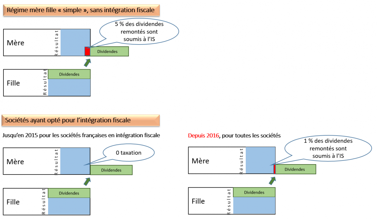 Dans le cas de sociétés établies et soumises à l’IS en France, ayant opté pour le régime d’intégration fiscale, cette base taxable de 5 % était supprimée, jusqu’en 2015. En termes fiscaux, c’est ce qu’on appelait la « neutralisation de la quote-part pour frais et charges ». Résultat : les dividendes perçus par une société mère en intégration fiscale n’étaient pas du tout soumis à l’IS.